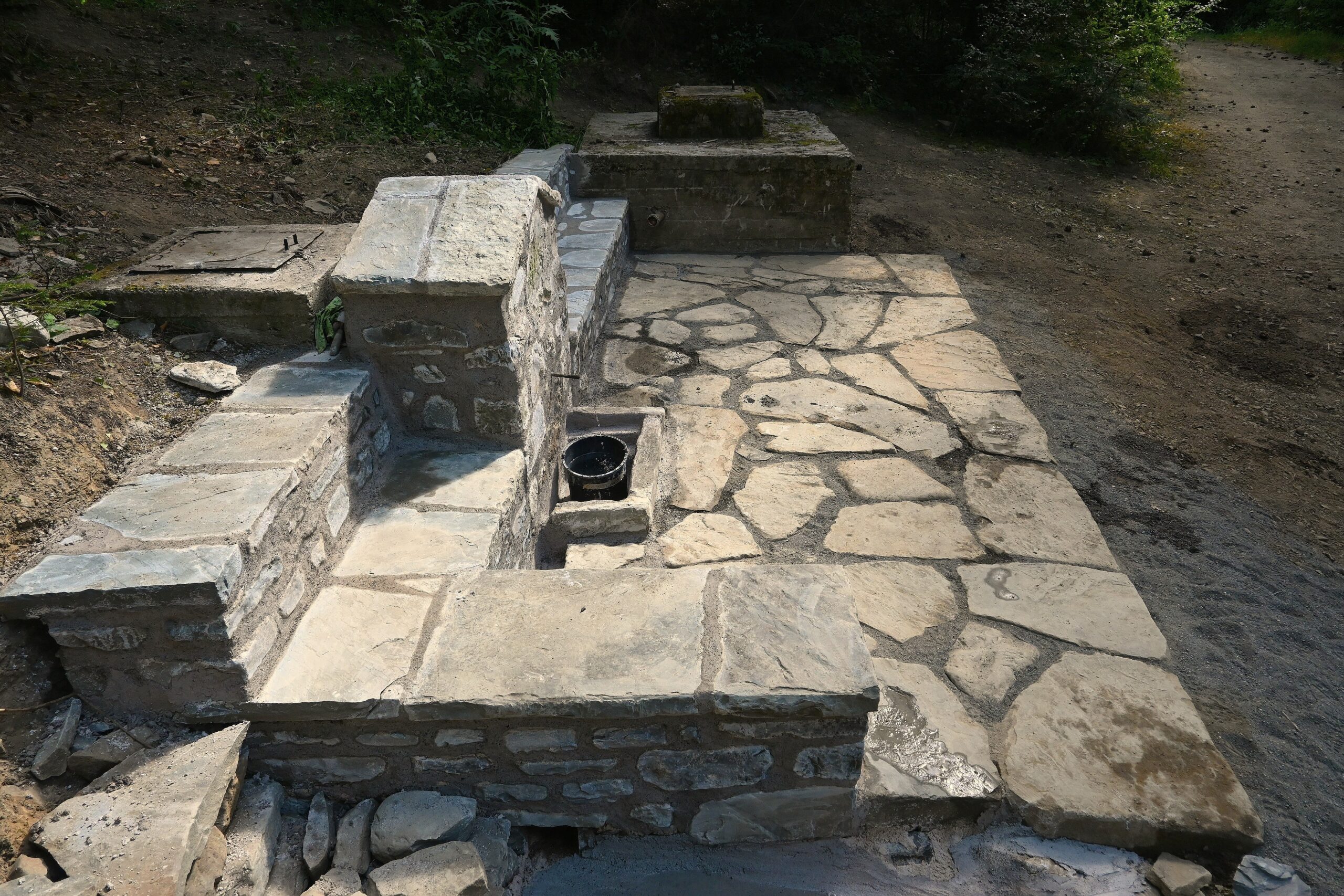 The project culminated in hands-on workshops at the fountains of Pigadoulia Agios Theodoros and Xoulia. More than a total of 35 participants from Greece, France, and Italy, along with volunteers, a Ph.D. researcher from Princeton University, and Boulouki’s team, worked under the guidance of master stonemasons Kostas Tzinas and Vasilis Samaras. Together, they restored the stone structure of two fountains, replacing cement-based mortar with on-site prepared lime-based mixtures, constructed a wildlife drinking trough featuring a stepped ramp for safe access, and added stone benches. Maintenance of a third fountain also took place to provide water both to humans and wildlife.