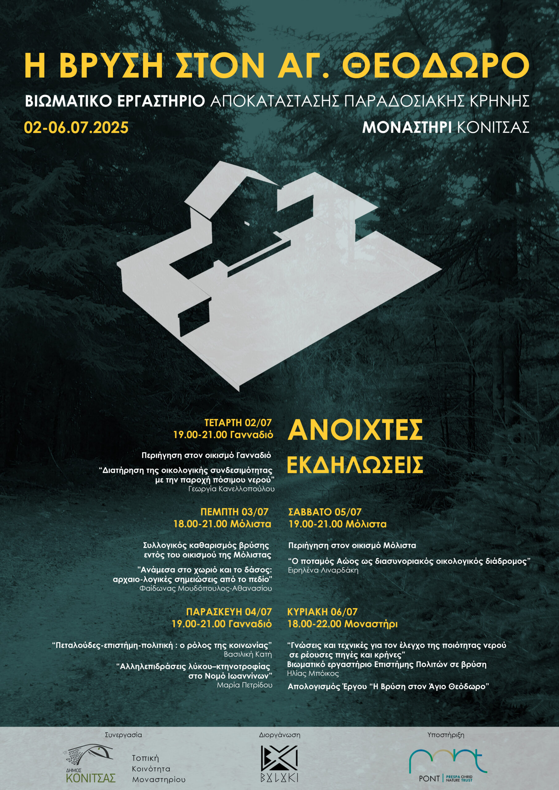 Funded by the Prespa Ohrid Nature Trust (PONT) and co-financed by the Municipality of Konitsa and Leventis Foundation, the project aimed to maintain and enhance the ecological corridors of the brown bear and wolf by securing access to fresh drinking water. In partnership with Callisto, ecological corridors were studied through field surveys and habitat models, while the HSGME investigated hydrogeological features that support water availability. Boulouki’s contribution focused on researching and documenting traditional knowledge of natural resource management and hydraulic building techniques, with the active participation of the Mastorochoria communities.