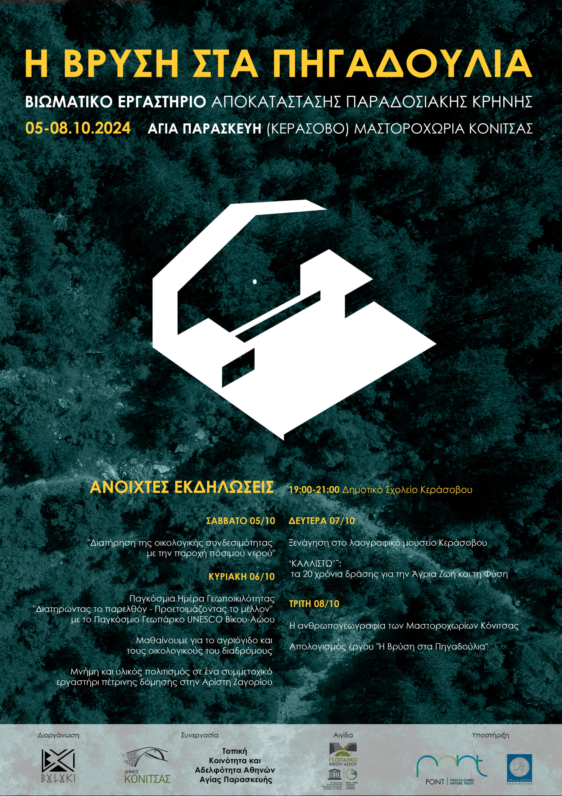 Boulouki, in collaboration with the Municipality of Konitsa and the local communities of Kerasovo, Monastiri, and Pyrgos, implemented this project that addresses one of the most pressing challenges of our time: ensuring the harmonious coexistence of human-wildlife and the environment under the conditions of water scarcity brought about by the climate crisis. At the heart of this initiative lies the restoration of two traditional fountains, enriched with small-scale infrastructure for water collection that also serves the needs of wildlife and the maintenance of a third fountain.