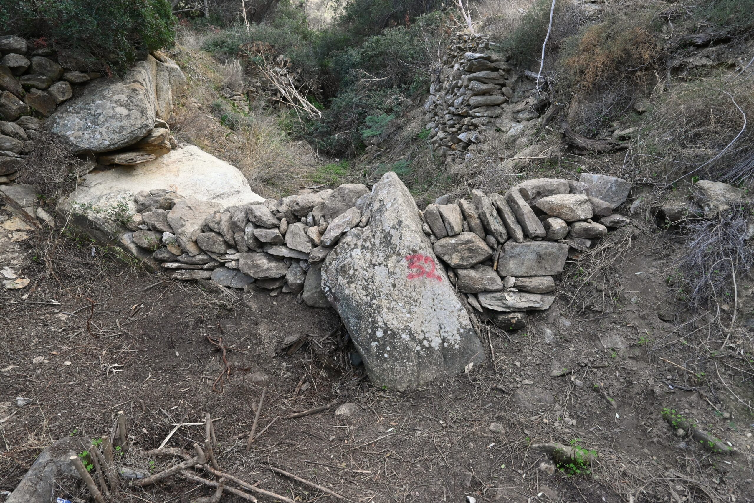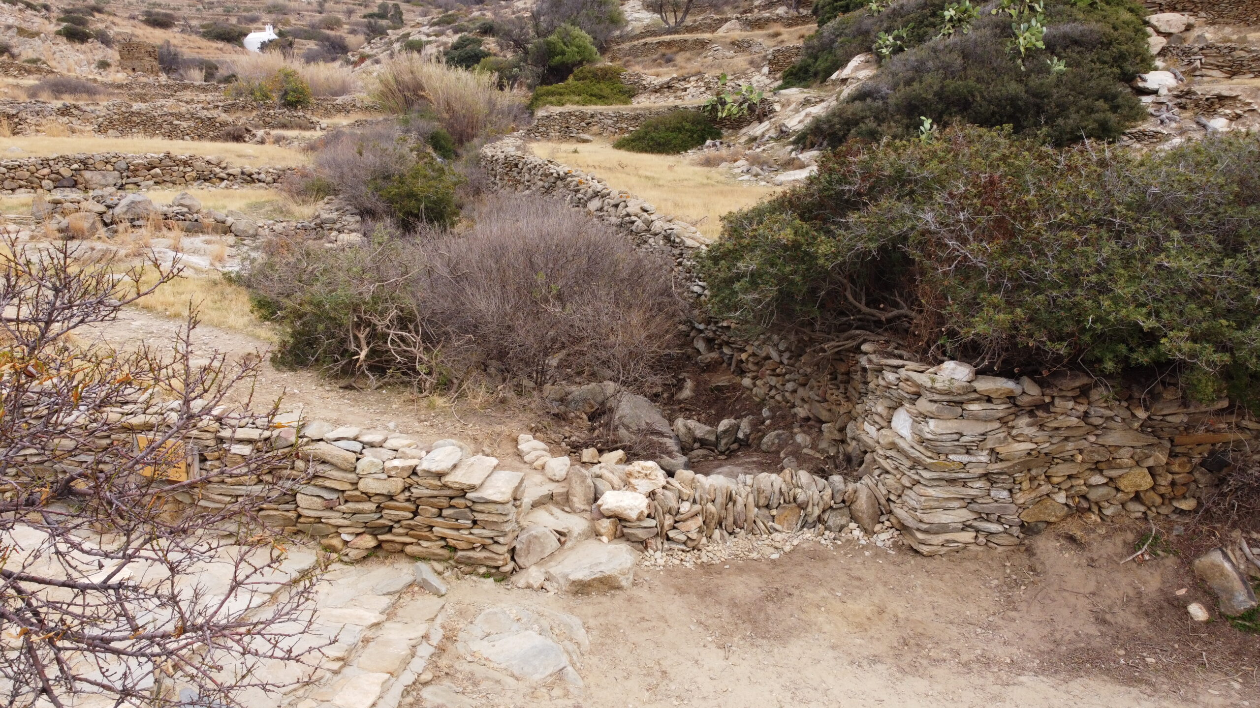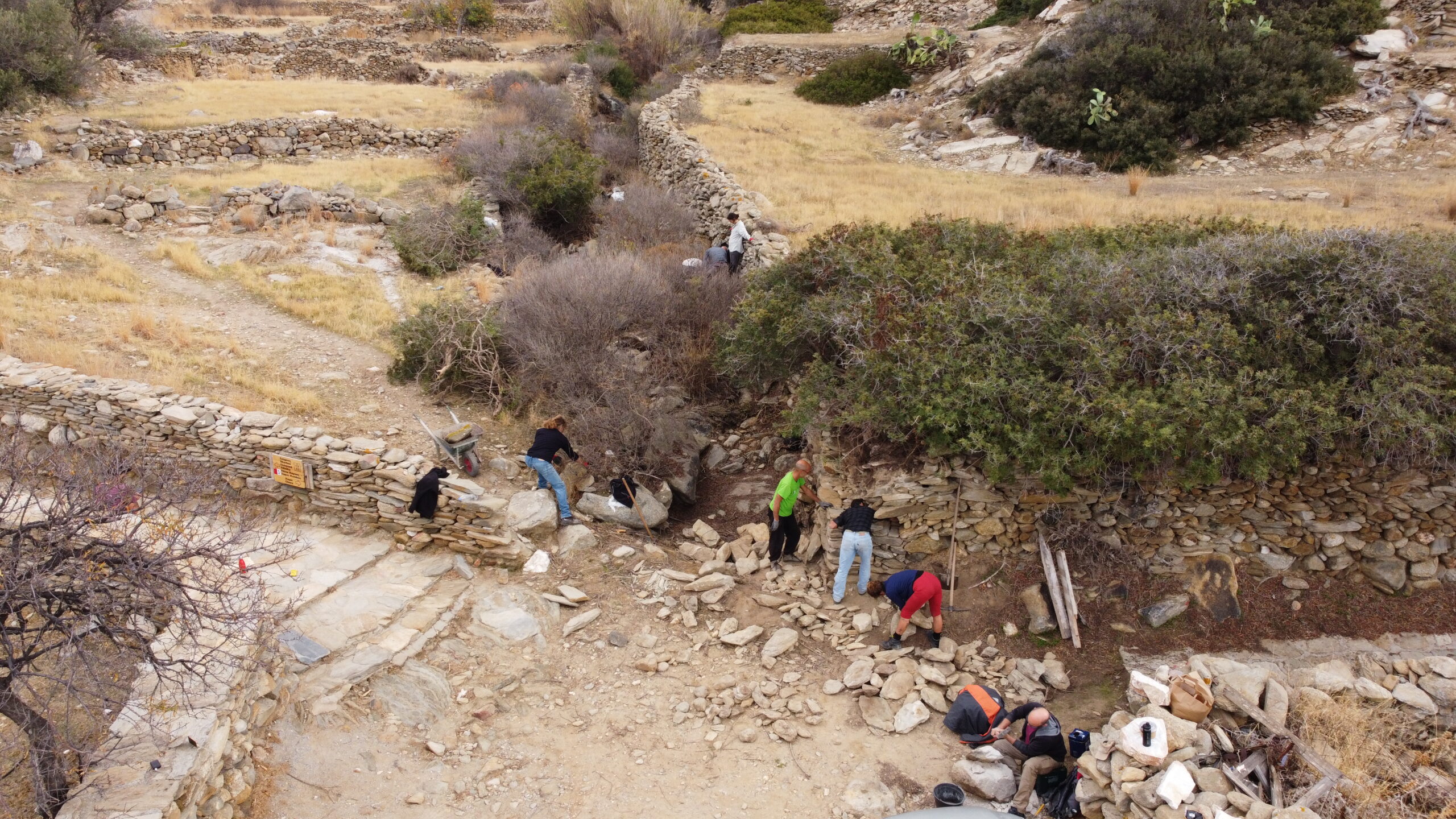 The SOUVALES project focused on constructing a network of 50 small-scale dry-stone weirs. This initiative included an apprenticeship and hands-on workshop on the traditional practice of water management with micro-dams (souvales). The network of 50 dry-stone micro-dams was constructed along the Mavroudí stream in Kambos, Ios, near the archaeological site of Skarkos. The project was carried out through a participatory process that combined a dual educational program (apprenticeship and hands-on workshop) with the involvement of volunteers from Ios, other parts of Greece, and abroad.