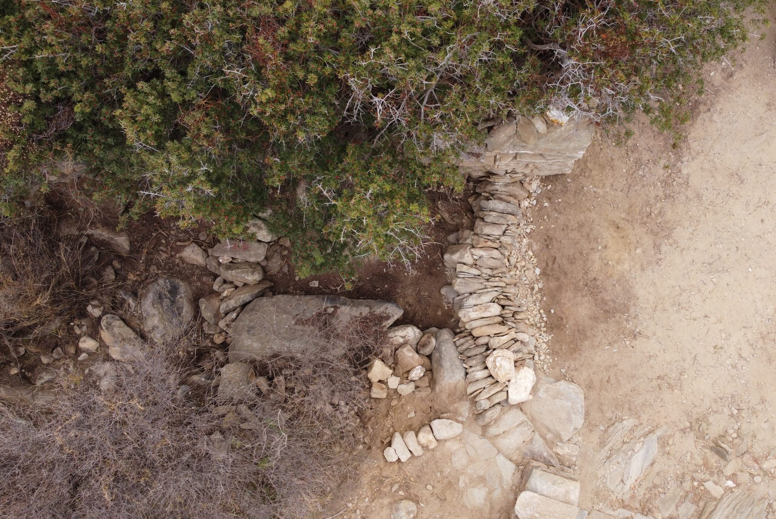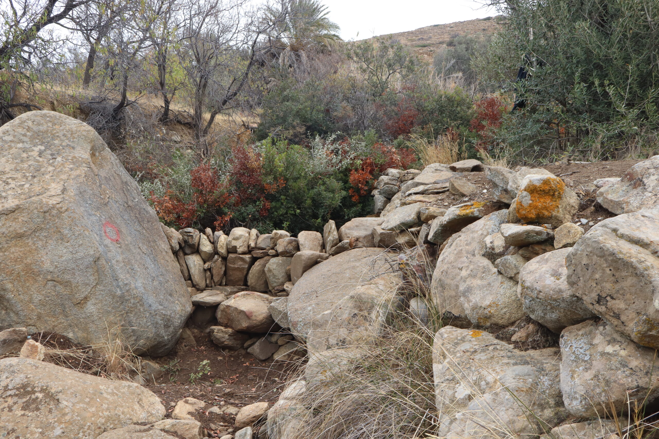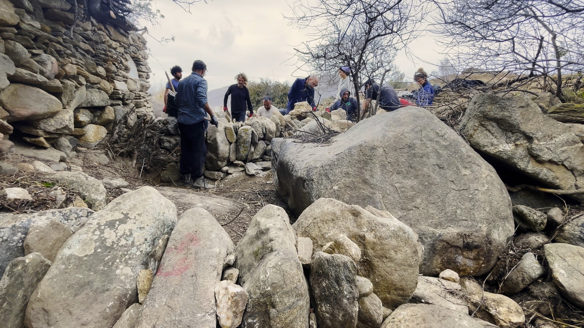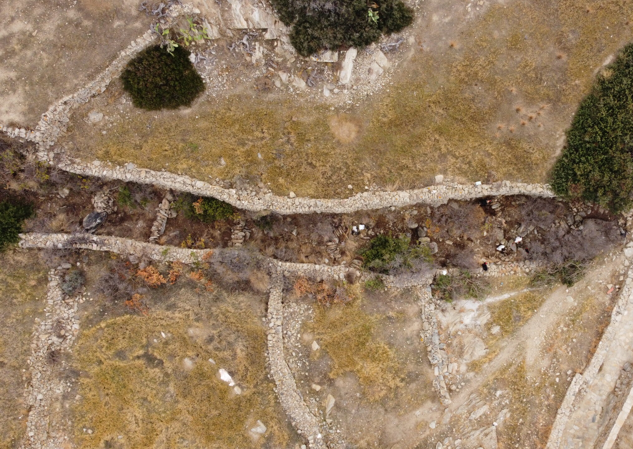 The SOUVALES project focused on constructing a network of 50 small-scale dry-stone weirs. This initiative included an apprenticeship and hands-on workshop on the traditional practice of water management with micro-dams (souvales). The network of 50 dry-stone micro-dams was constructed along the Mavroudí stream in Kambos, Ios, near the archaeological site of Skarkos. The project was carried out through a participatory process that combined a dual educational program (apprenticeship and hands-on workshop) with the involvement of volunteers from Ios, other parts of Greece, and abroad.